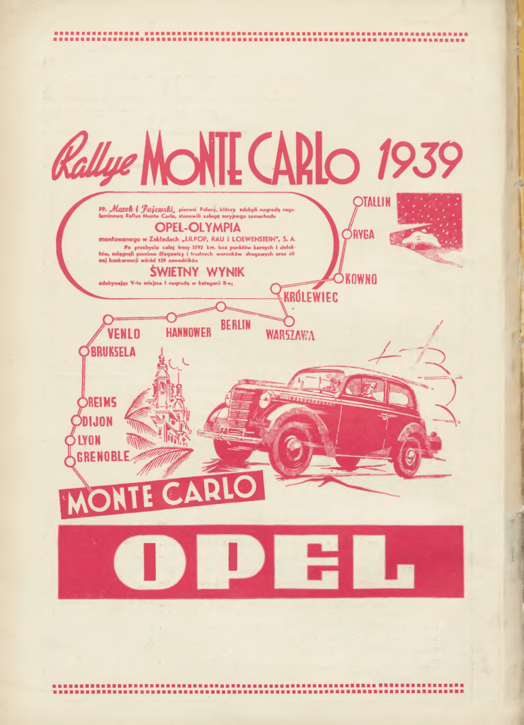 Inicjatywa odtworzenia przejazdu przybliżonej trasy międzynarodowego rajdu Monte Carlo z 1939 roku, gdzie polska załoga zajęła 5 miejsce w klasyfikacji generalnej. Wydarzenie zakłada przejazd epokowym Oplem Olimpią (takim samym, jakiego prowadzili oryginalni zawodnicy) z 1939 roku, zachowanym w stanie oryginalnym, całej trasy od Tallina aż po Monte Carlo. Założenia współpracy były proste – dodać zupełnie nową, elegancką twarz wyjątkowemu projektowi z jednoczesnym nawiązaniem do zachowanych śladów historii.